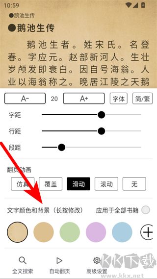 3、在閱讀設(shè)置頁面,可設(shè)置字距、行距、段距、翻頁動(dòng)畫等,還可長按文字顏色和背景區(qū)域選擇喜歡的背景顏色。