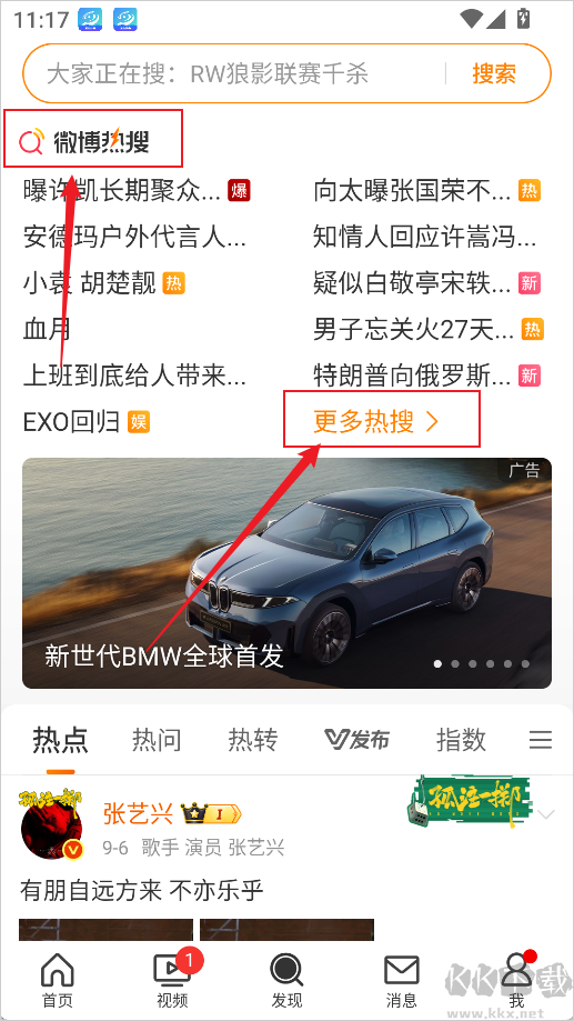 2、在發(fā)現(xiàn)頁頂部或中部找到【熱搜】入口,即可查看實時熱搜總榜。如需查看更多分類榜單(如文娛榜、同城榜),點擊【更多熱搜】進(jìn)入完整頁面。
