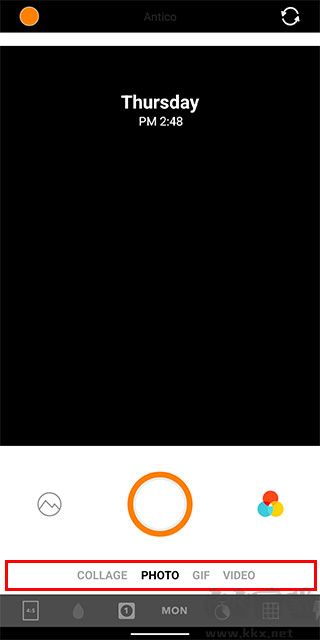 3、而工具欄上方是相機(jī)拍攝類型從左到右分別是拼貼連拍、相機(jī)、gif、錄像