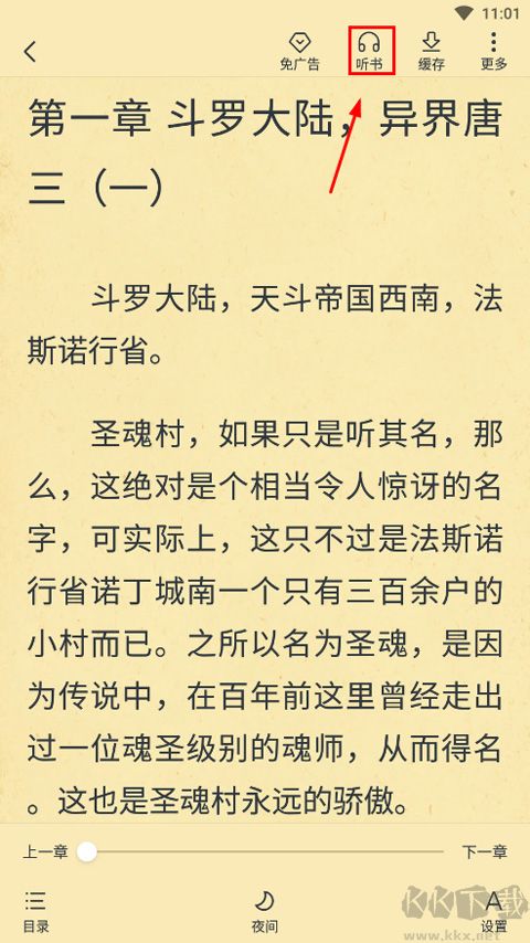 2、打開(kāi)小說(shuō)后,點(diǎn)擊屏幕中間,然后點(diǎn)擊右上角聽(tīng)書(shū);