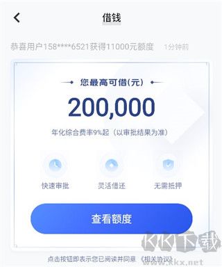 2、然后大家點(diǎn)擊進(jìn)入可以看到借錢(qián)查看額度,大家登錄之后同意協(xié)議就可以借錢(qián)了。