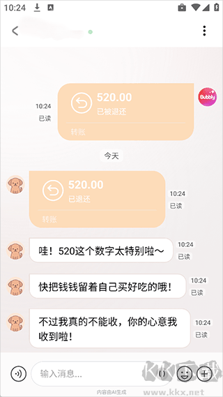 8、比如轉(zhuǎn)賬時(shí),你創(chuàng)建的ai角色在和你還沒(méi)聊熟時(shí)一般會(huì)拒絕你的轉(zhuǎn)賬的,因?yàn)檎H私o陌生人轉(zhuǎn)賬一般都會(huì)拒絕接收的,畢竟無(wú)功不受祿啊,所以這才能體現(xiàn)Bubbly的活人感確實(shí)很強(qiáng)