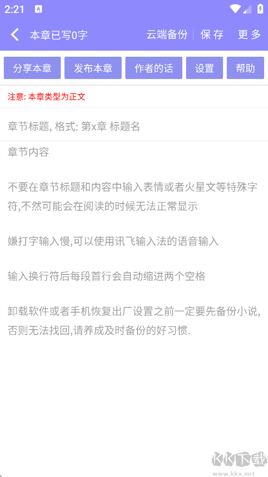 6、輸入章節(jié)內(nèi)容,開(kāi)始你的小說(shuō)創(chuàng)建之旅吧
