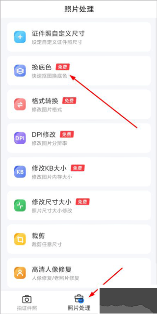 2、打開照片處理,點擊換底色(也可選擇拍證件照頁面的換背景功能替換);
