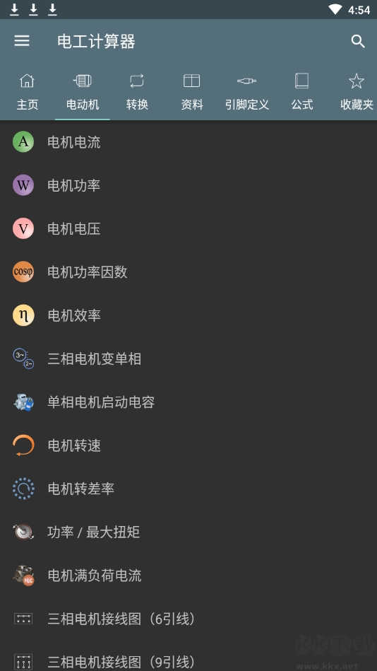 主要是根據(jù)電理學制作,融入了電工的實際計算需求,為用戶提供電壓降、電流、電壓、有功功率、電機轉(zhuǎn)速、電機效率等多達幾十種電工計算,分類詳細,覆蓋電動機、轉(zhuǎn)換、引腳定義、公式、資料等各個方面,可以幫助用戶輕松快速的計算出各項電工工作問題。軟件操作也非常簡單,計算結(jié)果準確,誤差幾乎為零,無需連接網(wǎng)絡(luò),輸入相應(yīng)的參數(shù)即可自動完成計算,極大的提高了工作效率,適合不同的電氣行業(yè)從業(yè)者使用。另外,電工計算器不僅支持英語、法語、德語、意大利語、日語、俄羅斯語和中文等多國語言,各國朋友都能輕松駕馭,還可以自定義單位長度,面積單位等等,為用戶把記錄好所有計算都進行算數(shù)、轉(zhuǎn)換。