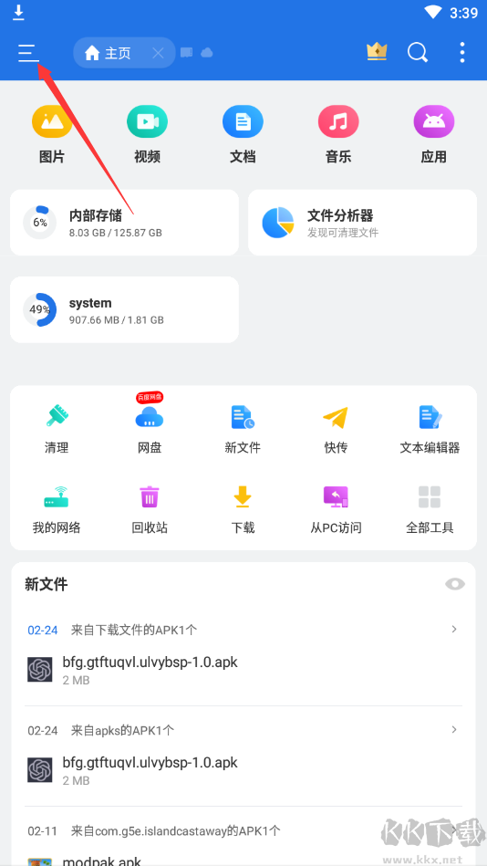 1、打開ES文件管理器之后,點擊左上方的三橫;