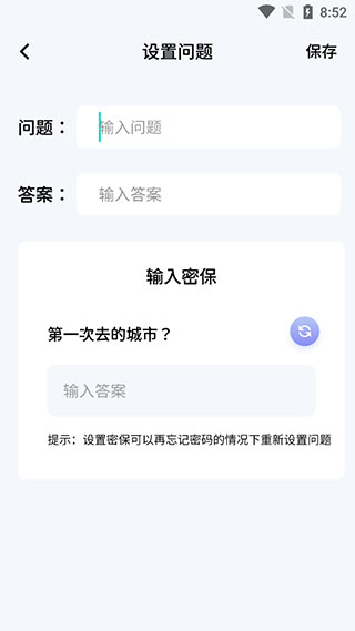 4、加密相冊需要設(shè)置問題和查看相冊的答案,還可以輸入密保問題,密??梢栽谕浖用芟鄡缘拿艽a的情況下重新設(shè)置問題。