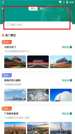 4、打開屏幕上方的搜索框,還可選擇境內(nèi)或境外,輸入想去的地方一鍵導(dǎo)航<
