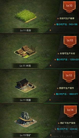 資源會影響你升級建筑、募兵及升級國器,所以建筑有空閑記得升一下資源田,這其中又以鐵礦、農(nóng)田優(yōu)先,這是因為銀幣和木材打流寇就有了,只要你有時間一小時打個300k銀幣一點也不是問題。在還沒上州之前糧草除了自行生產(chǎn)外,就只能打其他玩家掠奪了,不過要掠奪就需要有士兵,要有士兵就需要糧草,這是環(huán)環(huán)相扣的問題,所以有空閑記得把農(nóng)田升一升。鑌鐵在游戲中無法被掠奪但升級國器不能沒有他,因此這兩個的順序就由玩家自行拿捏。