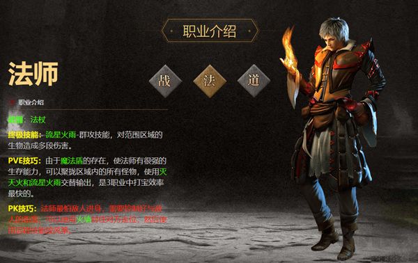PVE技巧:由于魔法盾的存在,使法師有很強(qiáng)的生存能力,可以聚攏區(qū)域內(nèi)的所有怪物,使用滅天火和流星火雨交替輸出,是3職業(yè)中打?qū)毿首羁斓摹?/p>