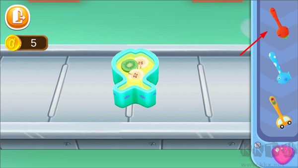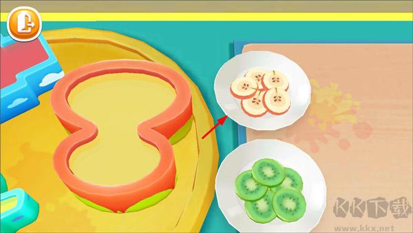 3、添加果醬后,切些水果放入。點(diǎn)擊右側(cè)水果,置于案板,切成合適大小備用。