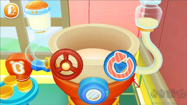 1、打開雪糕工廠,進(jìn)入游戲模式,先攪拌底料,點(diǎn)擊旋轉(zhuǎn)閥門,釋放奶油,讓其充分混合。