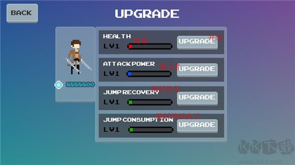 3、玩家可以升級自己角色的健康,能量等基本條件,升級會后攻擊力會更強;
