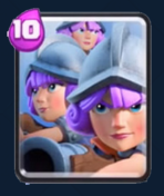 紫發(fā)美眉*3,理論上賺了3費(fèi),實際上比較笨重的一張卡牌。屬性和同級火槍手完全一樣,但是需要9費(fèi)施放。目前比較流行的三個火槍手應(yīng)用是圣水收集器積累費(fèi)用,巨人前方吸收傷害,三個火槍手后排安全輸出,后來優(yōu)化為大皮卡前排進(jìn)攻,火槍手在后,戰(zhàn)斗力更加強(qiáng)大但是費(fèi)用也更加笨重。三個火槍手相當(dāng)于群體輸出單位,同時對單體的傷害也非常高,對付各種目標(biāo)都游刃有余,當(dāng)然近身戰(zhàn)斗還是比較薄弱。