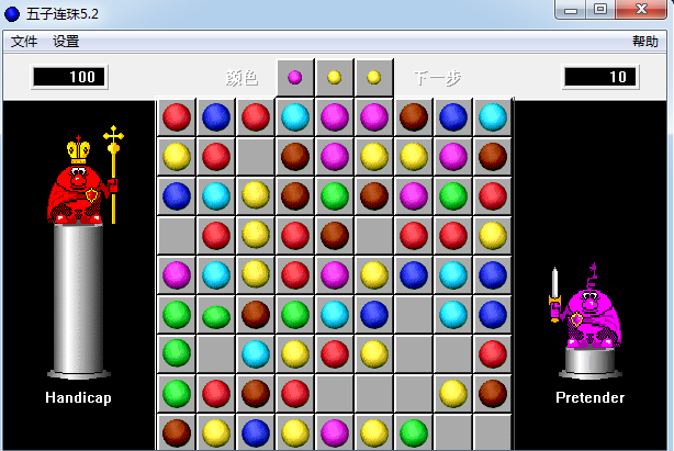 每移動(dòng)一次彩球,就會(huì)有三個(gè)球加入棋盤,如果移動(dòng)一個(gè)球,能組成五個(gè)以上同色球,就可消去一路,同時(shí)沒有三個(gè)球加入,移動(dòng)球到達(dá)的位置要有通道可過,根據(jù)消去的球記分,最高分保持王位。