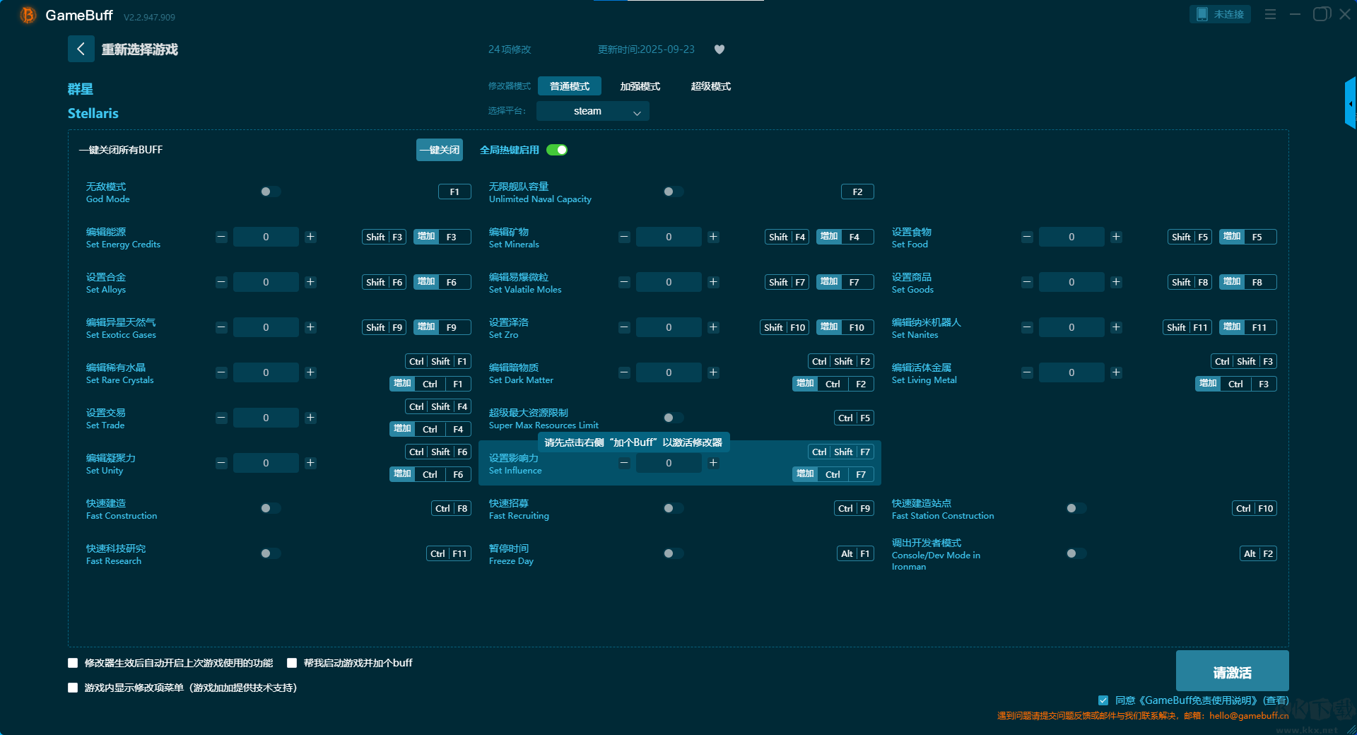 群星(Stellaris)二十四項(xiàng)修改器pc專業(yè)版是一款為游戲群星專項(xiàng)設(shè)計(jì)的游戲輔助修改功能。支持在游玩過程中開啟普通模式、加強(qiáng)模式、超級(jí)模式三項(xiàng)強(qiáng)大的輔助模式,你可以自由的在游玩過程中使用快捷鍵開啟關(guān)閉其中的任意一項(xiàng)功能。需要的小伙伴快來KK下載站下載,開啟你在游戲中的無敵之路,留下屬于你的奇妙傳說。