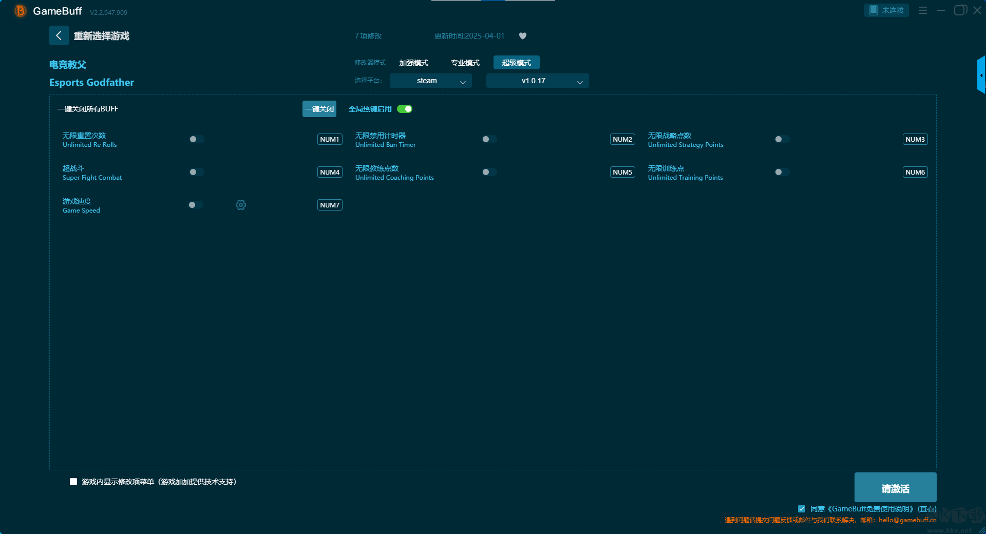 電競教父七項修改器pc終極版是一款供能強大且非常實用的游戲輔助工具修改器,這里有超多的游戲都可以進行修改玩耍,支持玩家在游玩過程中一鍵開啟,凍結禁用計時器、設置重置(重新投擲)、無限生命值(戰(zhàn)斗)、無限能量、無限訓練點、輕松擊殺(戰(zhàn)斗)、無限教練點數(shù)七項強大的輔助功能。需要的小伙伴快來KK下載站下載使用體驗吧。