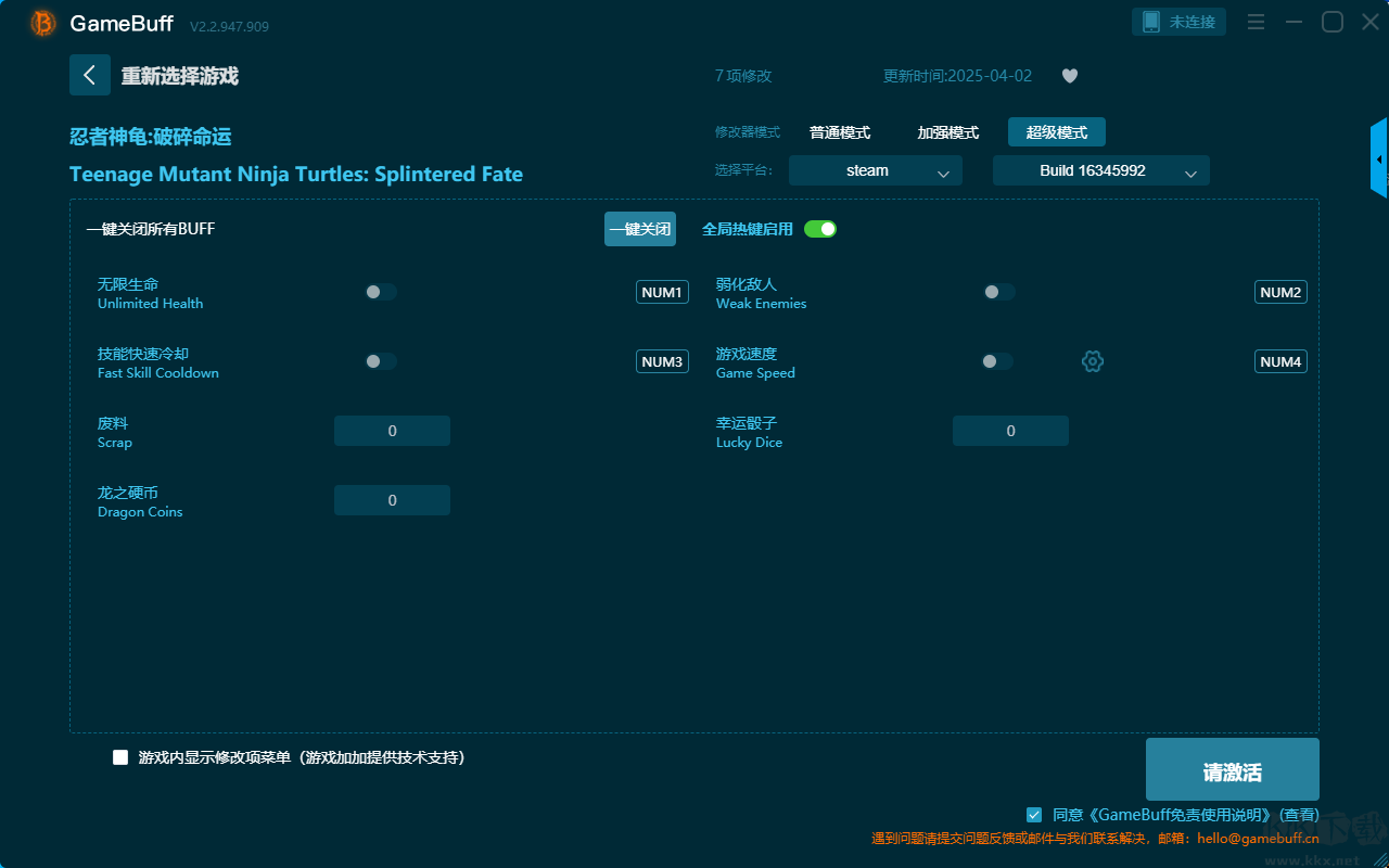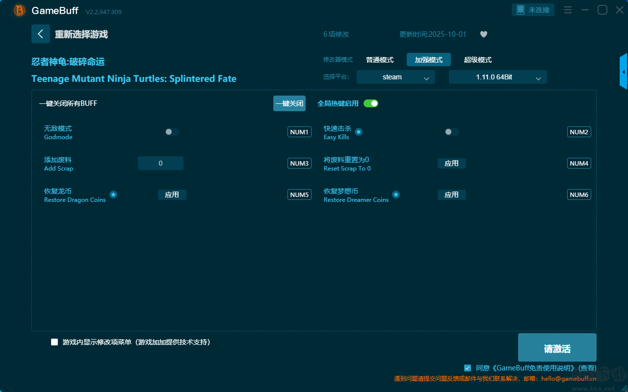 忍者神龜破碎命運(yùn)三項(xiàng)修改器pc官方版是一款使用且功能強(qiáng)大的游戲輔助修改器。玩家可在游玩過(guò)程中在普通、加強(qiáng)、超級(jí)等三個(gè)模式中選擇啟動(dòng),其中超級(jí)模式支持為游戲開(kāi)啟無(wú)限生命、技能快速冷卻、弱化敵人、幸運(yùn)骰子、廢料、龍之硬幣、游戲速度七項(xiàng)強(qiáng)大功能。喜歡的小伙伴快來(lái)KK下載站下載體驗(yàn)吧。