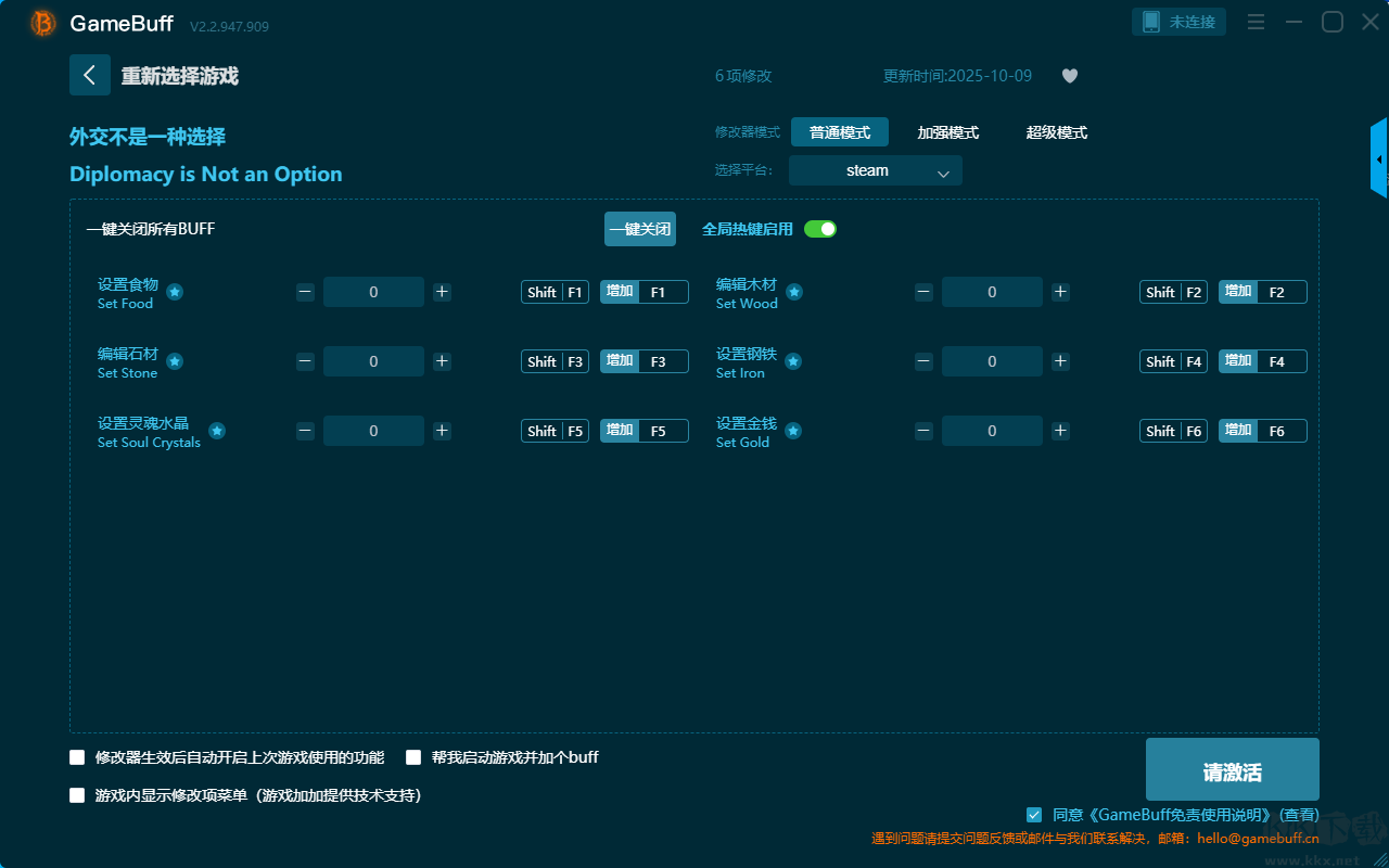 外交不是一種選擇六項修改器pc最終版是一款可以為游戲外交不是一種選擇開啟游戲修改輔助的強大工具。支持steam平臺開啟使用,在游玩的過程中可一鍵開啟設(shè)置食物、編輯木材、編輯石材、設(shè)置鋼鐵、設(shè)置金錢、設(shè)置靈魂水晶六項強大的修改能力。需要的小伙伴快來啊KK下載站下載游玩使用吧。