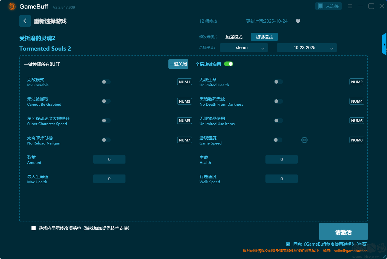 受折磨的靈魂2十二項(xiàng)修改器pc中文版是一款可為游戲受折磨的靈魂2進(jìn)行游戲輔助修改的游戲工具。玩家可在游戲過(guò)程中一鍵開啟,移動(dòng)速度倍率 (增益)、移動(dòng)速度倍率 (減益)、補(bǔ)充生命值、射速乘數(shù)、低生命值倍率、無(wú)法被抓取、移動(dòng)速度倍率(增益)等十二項(xiàng)加強(qiáng)模式修改功能。需要的小伙伴快來(lái)KK下載站下載這款強(qiáng)大的修改器體驗(yàn)使用一下吧。