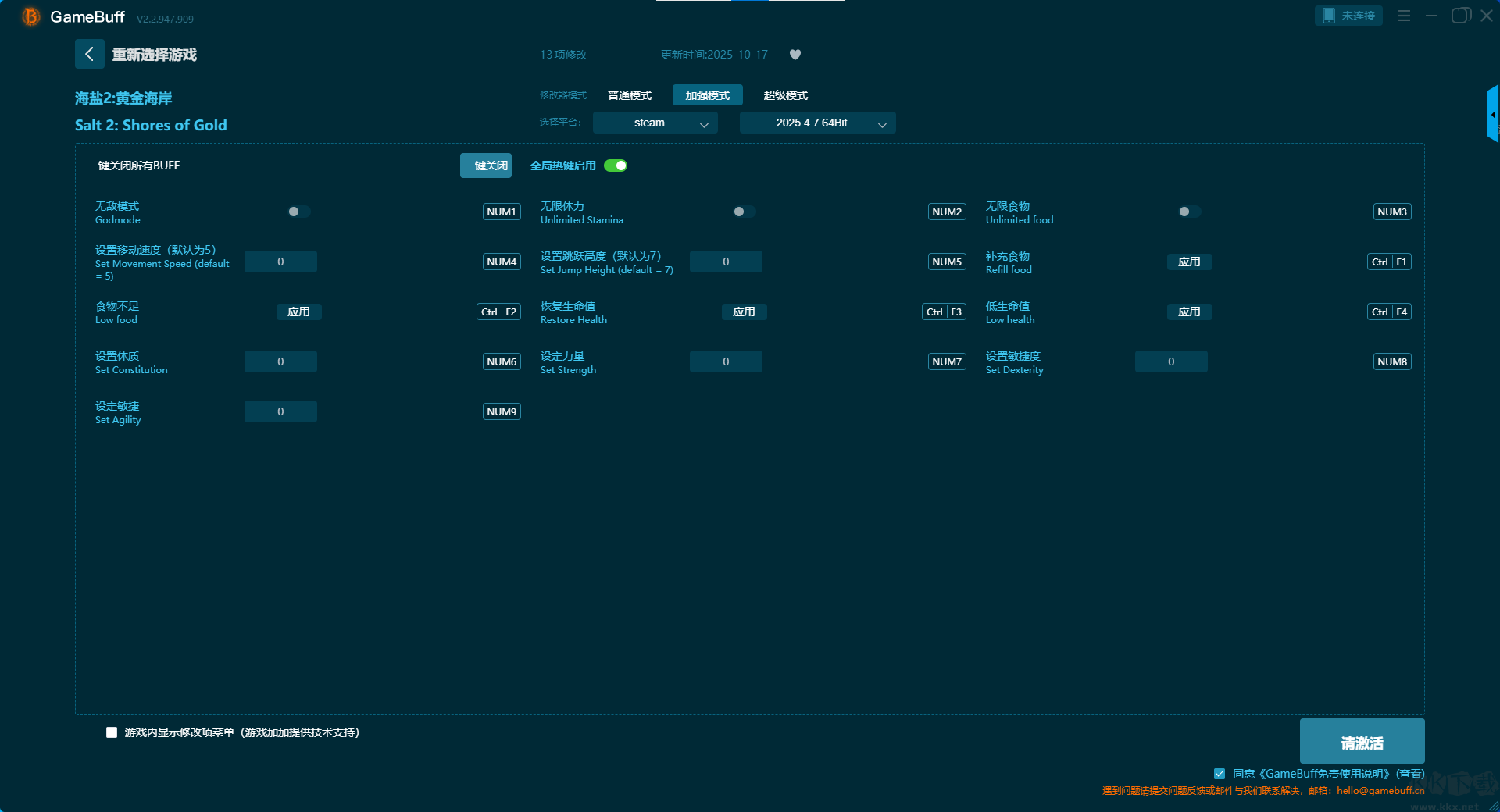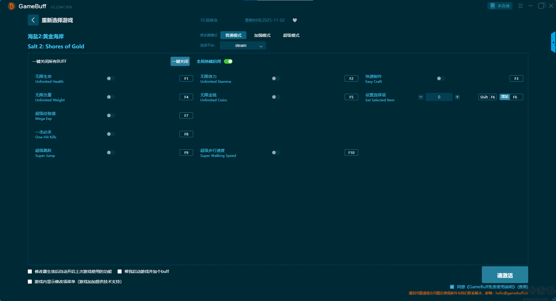 鹽2黃金海岸十項修改器pc綠色版是一款功能強(qiáng)大且實(shí)用的游戲輔助器。你可以在游戲鹽2黃金海岸中一鍵開啟,無限生命、無限體力、無限負(fù)重、快速制作、超級經(jīng)驗值、無限金錢、一擊必殺等10項普通模式修改功能,還支持steam平臺使用。喜歡的小伙伴快來KK下載站下載這款修改器體驗使用吧。