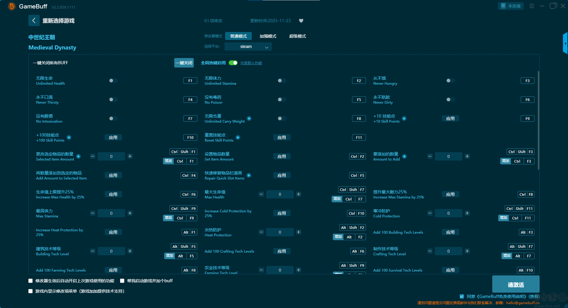 中世紀王朝六十一項修改器pc最終版是一款多功能的游戲輔助工具,支持在steam、gog、epic、uwp各大平臺使用。玩家可在游戲中世紀王朝的游玩過程中一鍵開啟,無限生命、無限體力、從不餓、永不口渴、沒有毒藥、永不骯臟、沒有醉酒、無限負重等多達61項修改功能??靵硐螺d這款修改器體驗一下吧。
