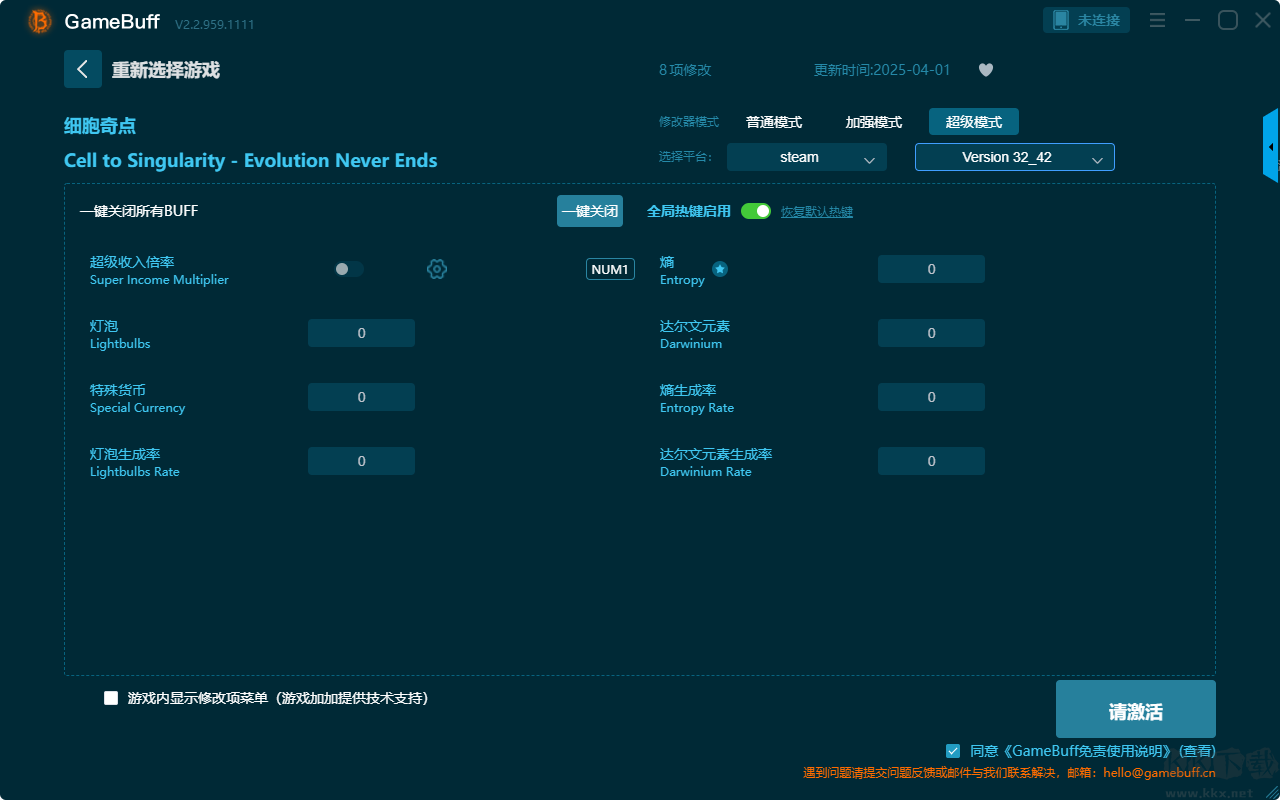 細(xì)胞奇點(diǎn)三項(xiàng)修改器pc豪華版是一款功能強(qiáng)大的游戲輔助工具。這款修改器支持7000+游戲修改,可自由選擇使用。玩家可在細(xì)胞奇點(diǎn)的游玩過(guò)程中一鍵開(kāi)啟,增加燈泡、增加化石、增加開(kāi)關(guān) / 暗物質(zhì)、增加元胚、添加熵 / 星塵等多項(xiàng)修改功能。快來(lái)KK下載站下載體驗(yàn),開(kāi)啟你的暢爽游玩之旅吧。