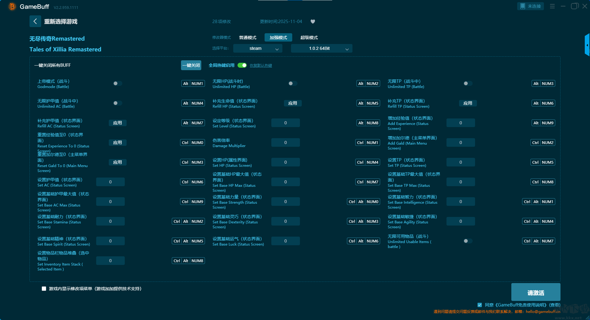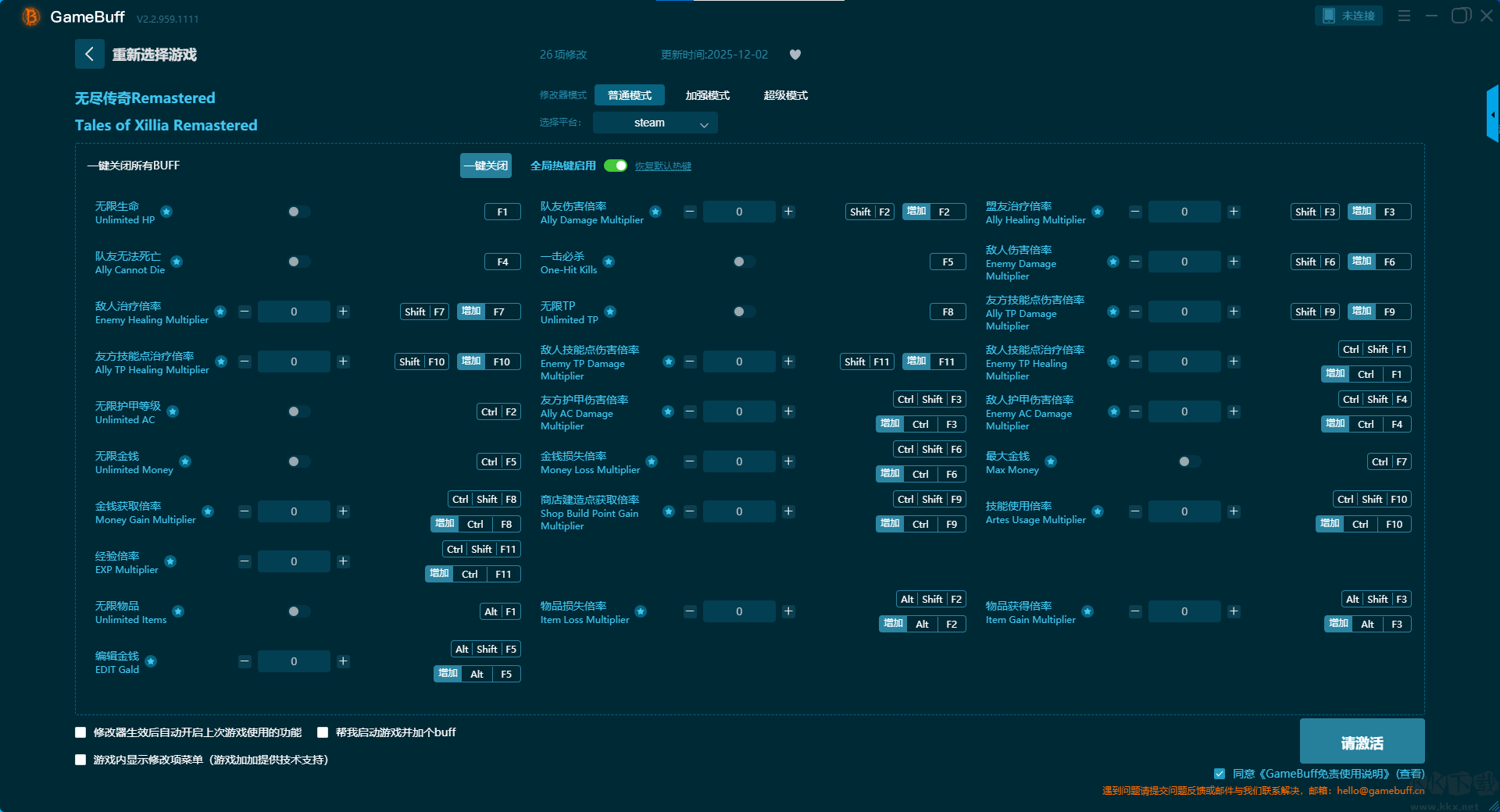 無(wú)盡傳奇二十六項(xiàng)修改器pc最終版是一款功能非常強(qiáng)大的游戲輔助工具,支持在steam平臺(tái)使用。玩家可在游戲中一鍵開(kāi)啟,一鍵關(guān)閉所有 BUFF、無(wú)限生命、隊(duì)友無(wú)法死亡、敵人治療倍率、友方技能點(diǎn)治療倍率、無(wú)限護(hù)甲等級(jí)、無(wú)限金錢(qián)、金錢(qián)獲取倍率等超多項(xiàng)修改功能。喜歡的小伙伴快來(lái)KK下載站下載體驗(yàn)一下吧。