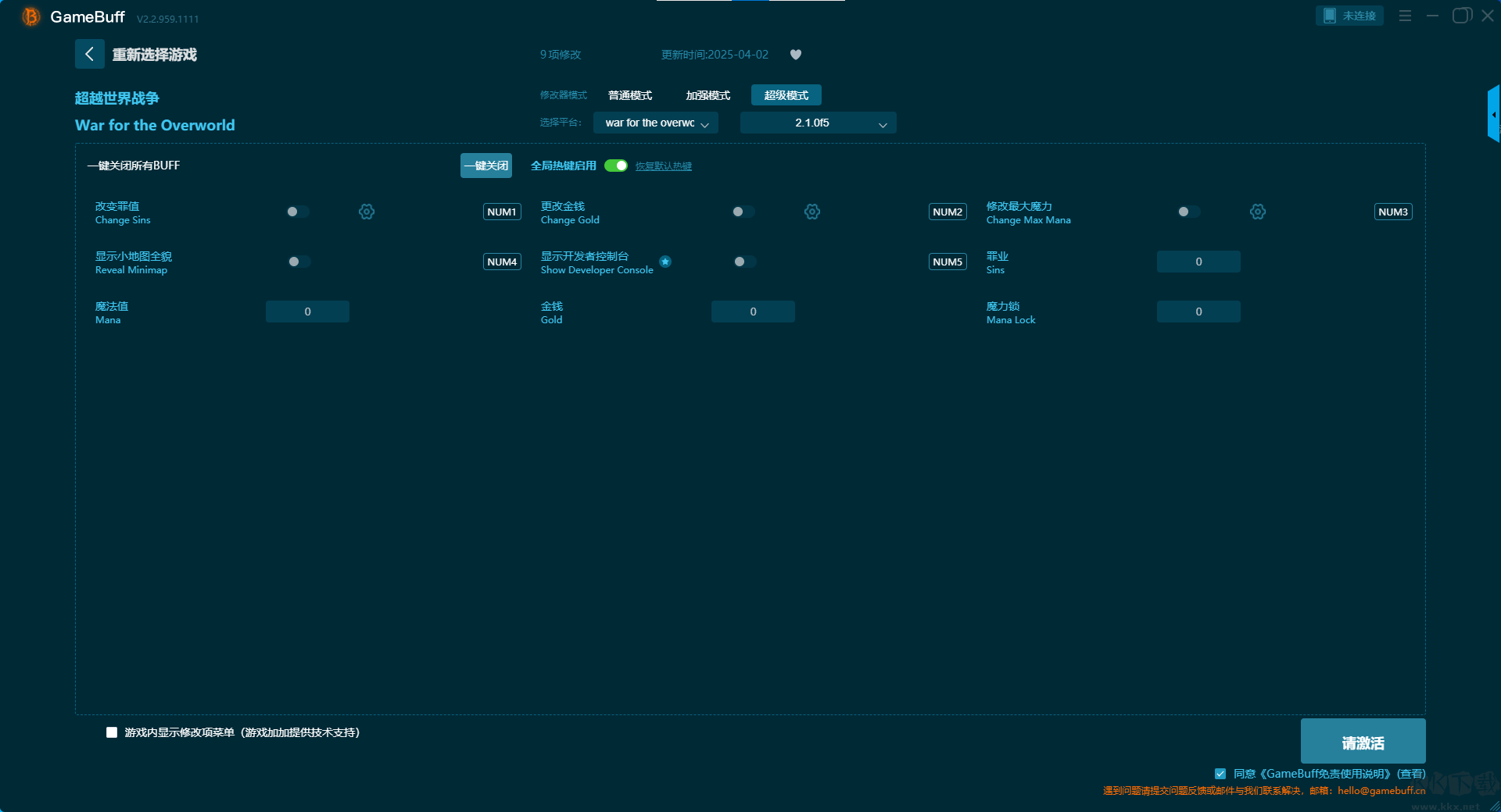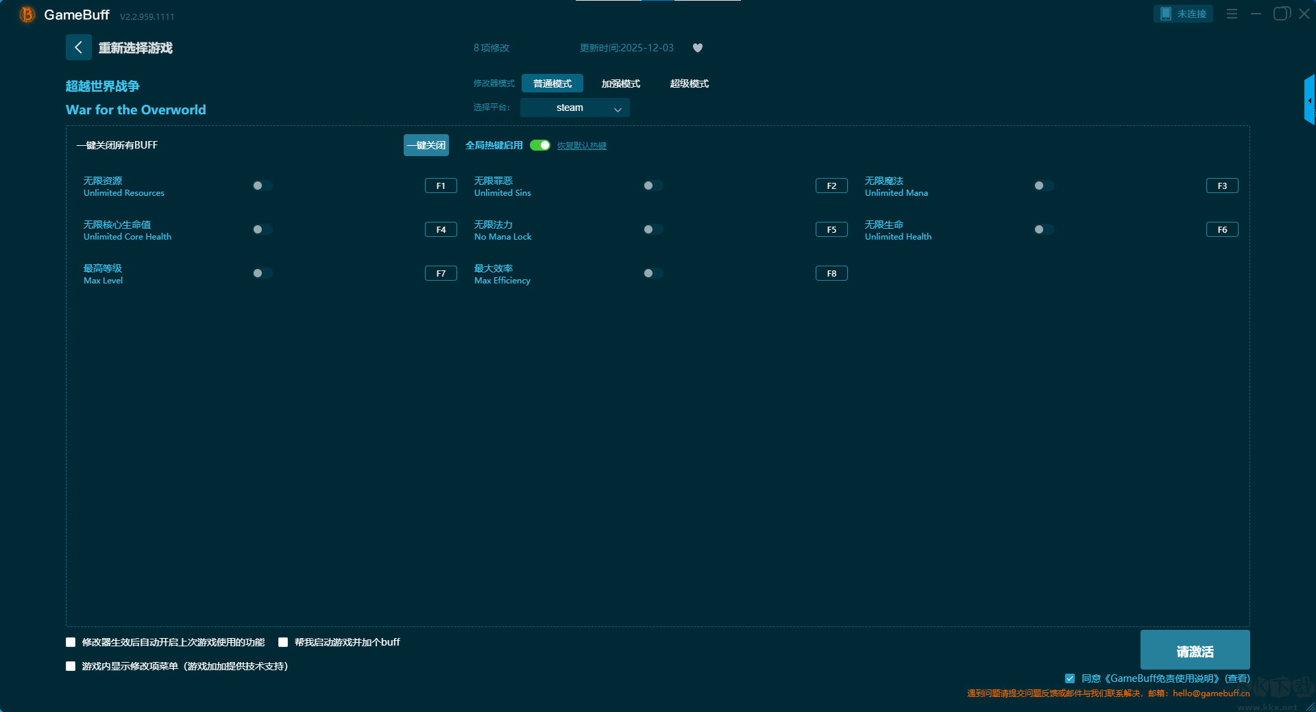 超越世界戰(zhàn)爭八項(xiàng)修改器pc國際版是一款專業(yè)強(qiáng)大的游戲輔助修改工具,玩家可在這款修改器中一鍵開啟,無限資源、無限罪孽、無限魔法、無限核心生命值、無限法力、無限生命、最高等級、最大效率等多項(xiàng)普通模式修改器功能,支持在steam平臺使用。需要的小伙伴快來KK下載站下載體驗(yàn)一下吧。