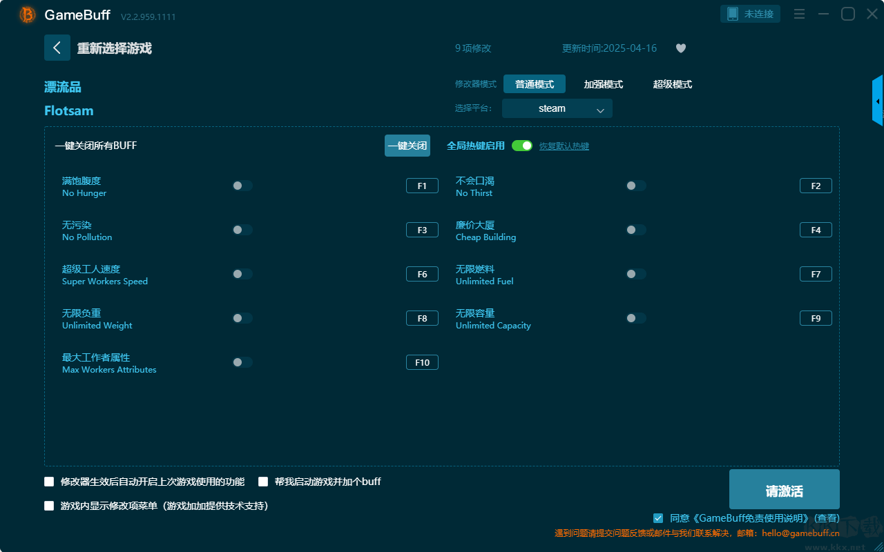 漂流品九項(xiàng)修改器pc完整版是一款專為游戲漂流品所打造的游戲輔助工具,支持玩家在steam平臺(tái)使用,可為7000+游戲進(jìn)行游戲輔助修改。玩家可在游戲漂流品的游玩過程中一鍵開啟,滿腹飽度、不會(huì)口渴、無污染、廉價(jià)大量、超級(jí)工人速度、無限燃料、無限負(fù)重、無限容量、最大工作者屬性等修改功能??靵鞬K下載站下載體驗(yàn)一下吧。