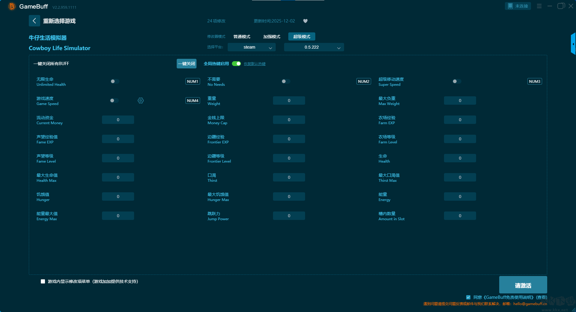 牛仔生活模擬器二十項(xiàng)修改器pc專業(yè)版超級(jí)模式 (支持 24 項(xiàng)修改,不支持聯(lián)網(wǎng)模式)