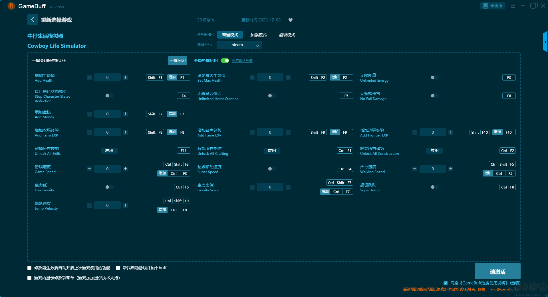 牛仔生活模擬器二十項(xiàng)修改器pc專業(yè)版加強(qiáng)模式 (支持 20 項(xiàng)修改,不支持聯(lián)網(wǎng)模式)
