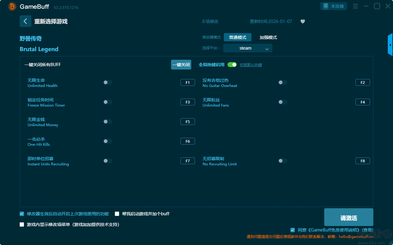 野獸傳奇八項修改器pc國際版是一款專為PC單機(jī)游戲設(shè)計的多功能輔助工具,致力于為玩家提供更自由、更便捷的游戲體驗。你可以為游戲野獸傳奇一鍵開啟,無限生命、鎖定任務(wù)時間、無限金錢、一擊必殺、即時單位招募、沒有吉他過熱、無限粉絲、無招募限制等超多修改功能。需要的小后半快來KK下載站下載體驗吧。