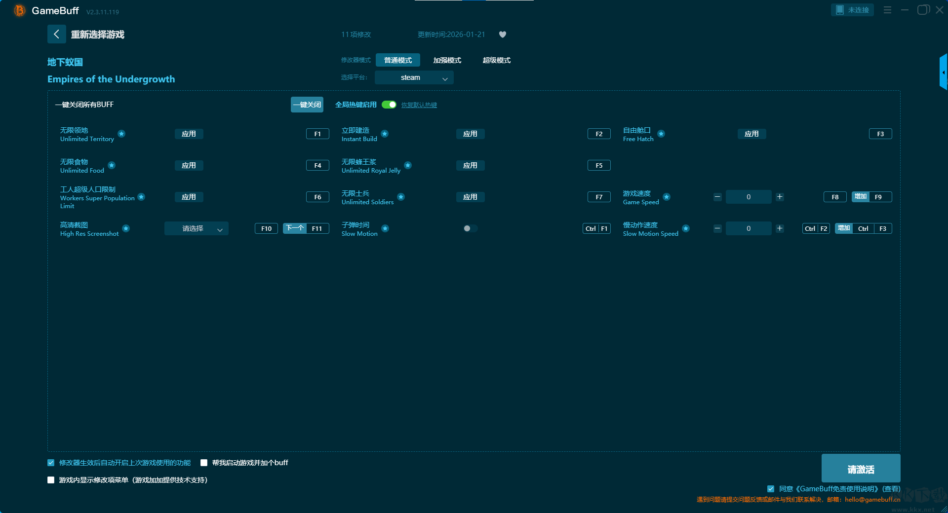 地下蟻國十一項修改器pc正式版是一款致力于為玩家提供更加自由、輕松的游戲體驗,通過技術(shù)手段對游戲運行時的數(shù)據(jù)進行臨時修改,從而實現(xiàn)多種便利功能??梢詾橛螒虻叵孪亣_啟,無限領(lǐng)地、無限食物、工人超級人口限制、高清截圖、立即建造、無限蜂王漿、無限士兵等豐富修改功能。喜歡這款修改器的小伙伴快來KK下載站下載體驗吧。