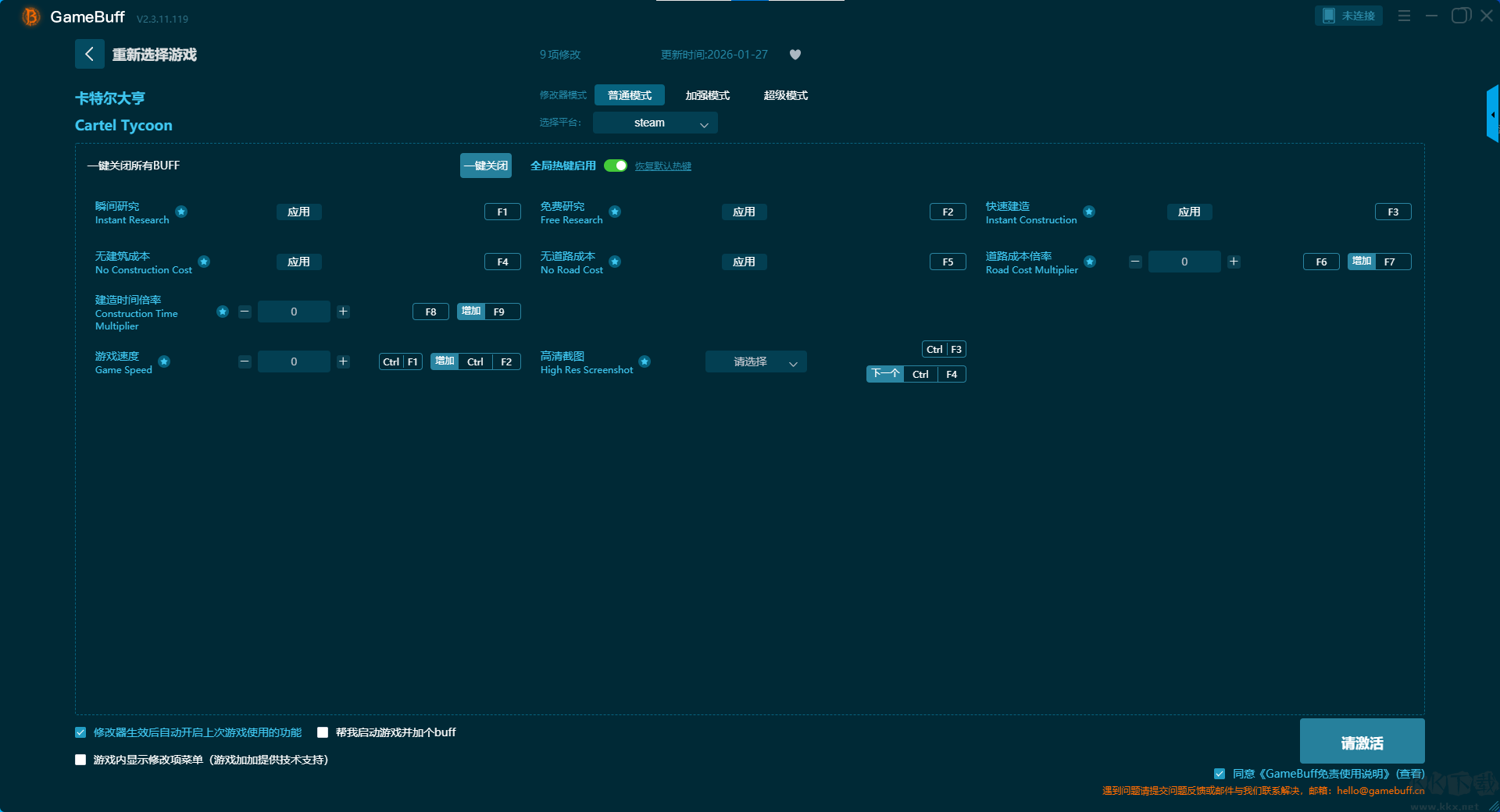 卡特爾大亨九項(xiàng)修改器pc最終版是一款專(zhuān)為游戲愛(ài)好者打造的系統(tǒng)級(jí)內(nèi)存修改工具。通過(guò)深度優(yōu)化游戲參數(shù),為玩家解鎖更自由、更具探索性的游戲體驗(yàn)。還支持為游戲卡特爾大亨一鍵開(kāi)啟,瞬間研究、免費(fèi)研究、快速建造、無(wú)建筑成本、無(wú)道路成本、道路成本倍率、建造時(shí)間倍率等超多修改功能。喜歡這款修改器的小伙伴快來(lái)KK下載站下載吧。