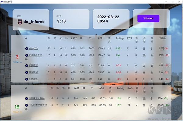 4、實(shí)時(shí)戰(zhàn)績(jī)統(tǒng)計(jì)系統(tǒng),對(duì)CSGO每局比賽的各類數(shù)據(jù)進(jìn)行實(shí)時(shí)記錄,方便玩家了解自己和他人的水平變化狀況。