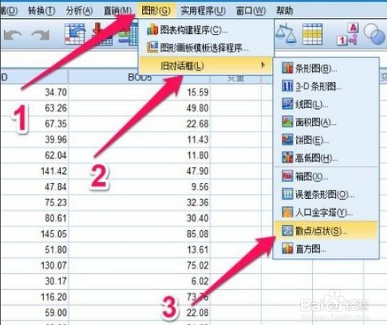 2、接下來(lái)就是開(kāi)始做回歸分析建立模型,研究其變化趨勢(shì),因?yàn)榛貧w分析分為線性回歸和非線性回歸,分析它們的辦法是不同的,所以先要把握它們的變化趨勢(shì),可以畫(huà)散點(diǎn)圖,點(diǎn)擊【圖形】---【舊對(duì)話框】---【散點(diǎn)/點(diǎn)狀】