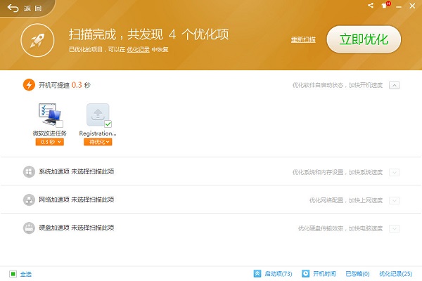一鍵優(yōu)化、深度優(yōu)化、我的開(kāi)機(jī)時(shí)間、啟動(dòng)項(xiàng)、優(yōu)化記錄與恢復(fù)