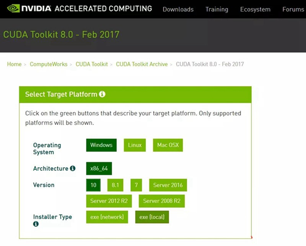 接下來就是和GPU相關(guān)的CUDA8了,選擇相應(yīng)的系統(tǒng)版本便可以下載安裝。在安裝方式這一步建議大家使用本地安裝exe[local]的方式,exe[network]的安裝方式….可能有點(diǎn)慢。默認(rèn)情況下CUDA會(huì)自動(dòng)幫你添加到環(huán)境變量,如果沒有,請(qǐng)手動(dòng)添加,這一步非常重要。