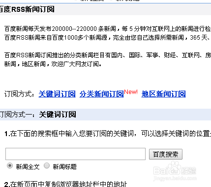 在百度中搜索百度RSS新聞?dòng)嗛喛蛇M(jìn)入訂閱界面,在下圖搜索框中輸入你感興趣的關(guān)鍵詞搜索,復(fù)制打開(kāi)的新頁(yè)面鏈接在閱讀器新建訂閱,即可訂閱網(wǎng)絡(luò)新聞中你所感興趣的特定信息。
