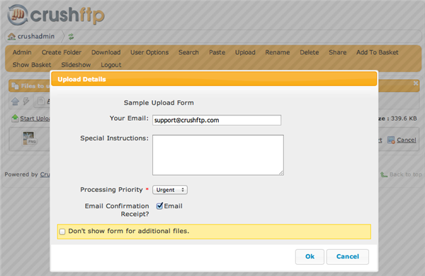當項目投放到界面上,或使用正常的 "瀏覽... "方法選擇項目時,它們會被添加到上傳隊列中。如果為用戶的上傳定義了自定義表單,則會顯示該表單,要求用戶提供有關(guān)上傳的其他信息。自定義表單可以按用戶定義,功能非常強大和靈活。需要上傳附加信息是一種常見需求。