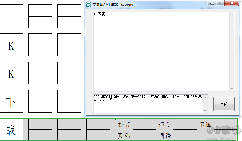 字典練習生成器是一款可以快速生成小學生練習查字典作業(yè)的生成器,只需要輸入文字,點擊生成,可快速生成查字典作業(yè),如拼音、部首、偏旁、頁碼、詞語、筆畫等等,假期給小學生出點提非常方便!