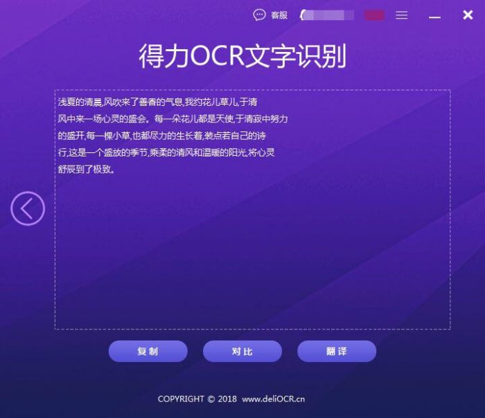 步驟四:等待小片刻,識別結(jié)果會自動呈現(xiàn)到得力OCR文字識別破解版上,這時(shí)候我們可以查看識別結(jié)果,確認(rèn)識別結(jié)果是否準(zhǔn)確的識別出文字來。確認(rèn)好后,可以點(diǎn)擊【復(fù)制】按鈕把識別出來的文字復(fù)制到粘貼板上并粘貼到文檔上進(jìn)行下一步編輯操作。當(dāng)然大家還可以點(diǎn)擊【對比】按鈕直接對比圖片和識別結(jié)果,按【翻譯】來翻譯識別結(jié)果。提示:批量操作無法在識別結(jié)果圖直接查看圖片內(nèi)容, 但是可以在相應(yīng)的對比界面來查看。