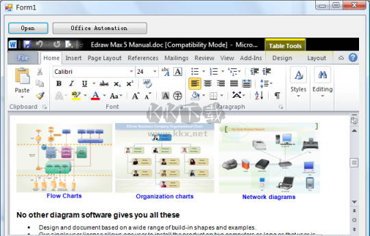 Edraw Office Viewer Component是用來解決從一個(gè)非頂層主機(jī)窗口使用ActiveX文檔的問題,并且服務(wù)器將作為一個(gè)構(gòu)建您內(nèi)置對(duì)象文件查看器或編輯器(以ActiveX控件的形式)的地方。