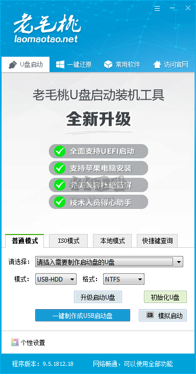 老毛桃u盤啟動(dòng)盤制作工具支持ghost與原版系統(tǒng)安裝,支持雙顯卡筆記本的引導(dǎo)進(jìn)pe,避免藍(lán)屏