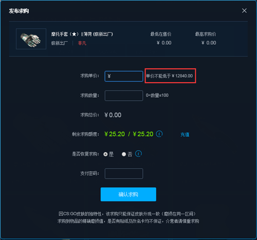 4、溫馨提示:您可以發(fā)起多件求購(gòu)需求,且無(wú)凍結(jié)金額,求購(gòu)需求金額上限為錢(qián)包余額的10倍。例:求購(gòu)a=150RMB,求購(gòu)b=100RMB,求購(gòu)c=50RMB,求購(gòu)d=30RMB,此時(shí)您的求購(gòu)總金額上限為1500RMB,如果您完成求購(gòu)b,凍結(jié)金額扣除100RMB,剩余50RMB,那您的求購(gòu)a會(huì)因余額不滿150RMB被暫停,求購(gòu)c、d仍然在線,此時(shí)您的求購(gòu)總金額上限為500RMB。當(dāng)您的余額恢復(fù)(例如充值、出售等獲得余額),您的求購(gòu)?fù)瑫r(shí)也會(huì)恢復(fù)。請(qǐng)您及時(shí)檢查求購(gòu)價(jià)格是否過(guò)期。求購(gòu)需求無(wú)法無(wú)限制發(fā)起。