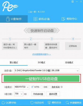 3、插入U盤/SD卡等可移動設(shè)備,在磁盤列表里會自動列出當(dāng)前電腦中所有的可移動磁盤的盤符、型號、容量等信息。點擊一鍵制作USB啟動盤 按鈕即可(注意制作U盤啟動盤會刪除U盤內(nèi)的所有數(shù)據(jù))