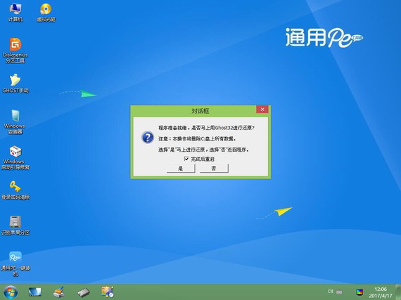 ⑥等待解壓GHO文件的進度條完畢后會自動彈出是否重啟電腦的窗口,我們現(xiàn)在只要點擊"是"按鈕即可,然后它就會自動重啟電腦,最后電腦將會自動安裝系統(tǒng),直到進入電腦桌面為止那就表示ghost系統(tǒng)安裝完畢了,見下圖所示: