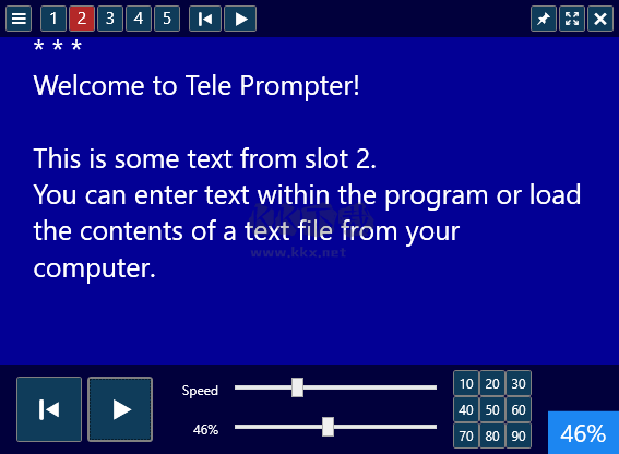TelePrompter提詞器中文版是一款便捷的電腦桌面提詞器,可以給用戶帶來(lái)強(qiáng)大得到輔助演講工具,可以很好的幫助演講者們?cè)谶@里輕松的進(jìn)行流暢準(zhǔn)確的演講,實(shí)時(shí)的為演講者們提供文字顯示,還支持調(diào)節(jié)速度,支持用戶們?cè)诰€跟隨文字的節(jié)奏進(jìn)行閱讀輕松的完成演講,超多的工具都可以免費(fèi)提供給大家,感興趣的用戶快來(lái)KK下載體驗(yàn)吧~