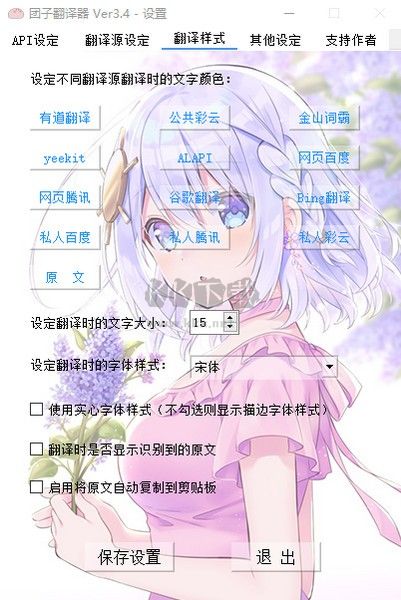 第三頁就是設(shè)置各個翻譯源顯示的時(shí)候的顏色,以及字體大小和字體樣式,按照自己的喜好來就好。另外可設(shè)置顯示的是實(shí)心字體還是描邊字體,建議描邊,然后可以設(shè)置是否顯示識別到的原文,以及是否將原文自動復(fù)制到粘貼板。